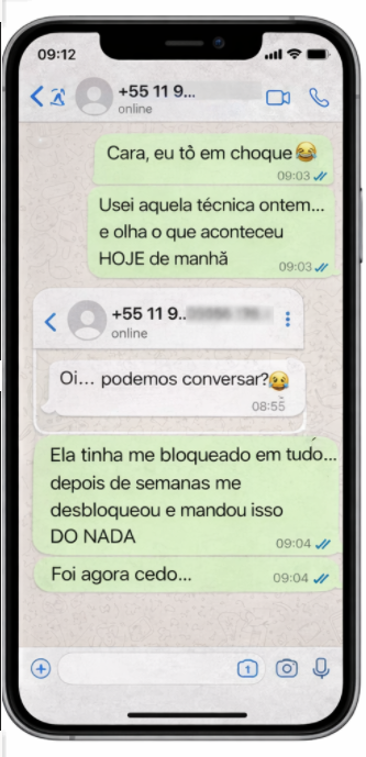 “Eu não acreditava muito no começo, mas resolvi tentar. Depois de alguns dias ela começou a me mandar mensagem novamente e disse que não parava de pensar em mim. Fiquei surpreso com o que aconteceu.